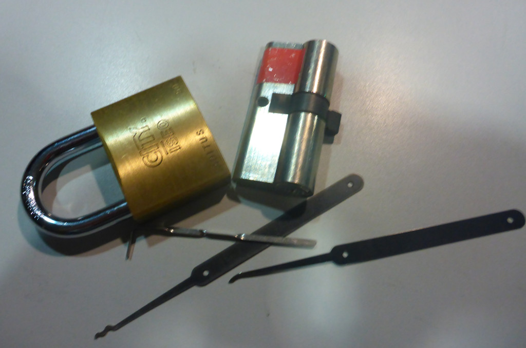 Nach einer klasse Einweisung von 4 Minuten bei lockpicking.org habe ich mein erstes Vorhängeschloss ohne Schlüssel geöffnet und kurz danach war das erste Türschloss dran.