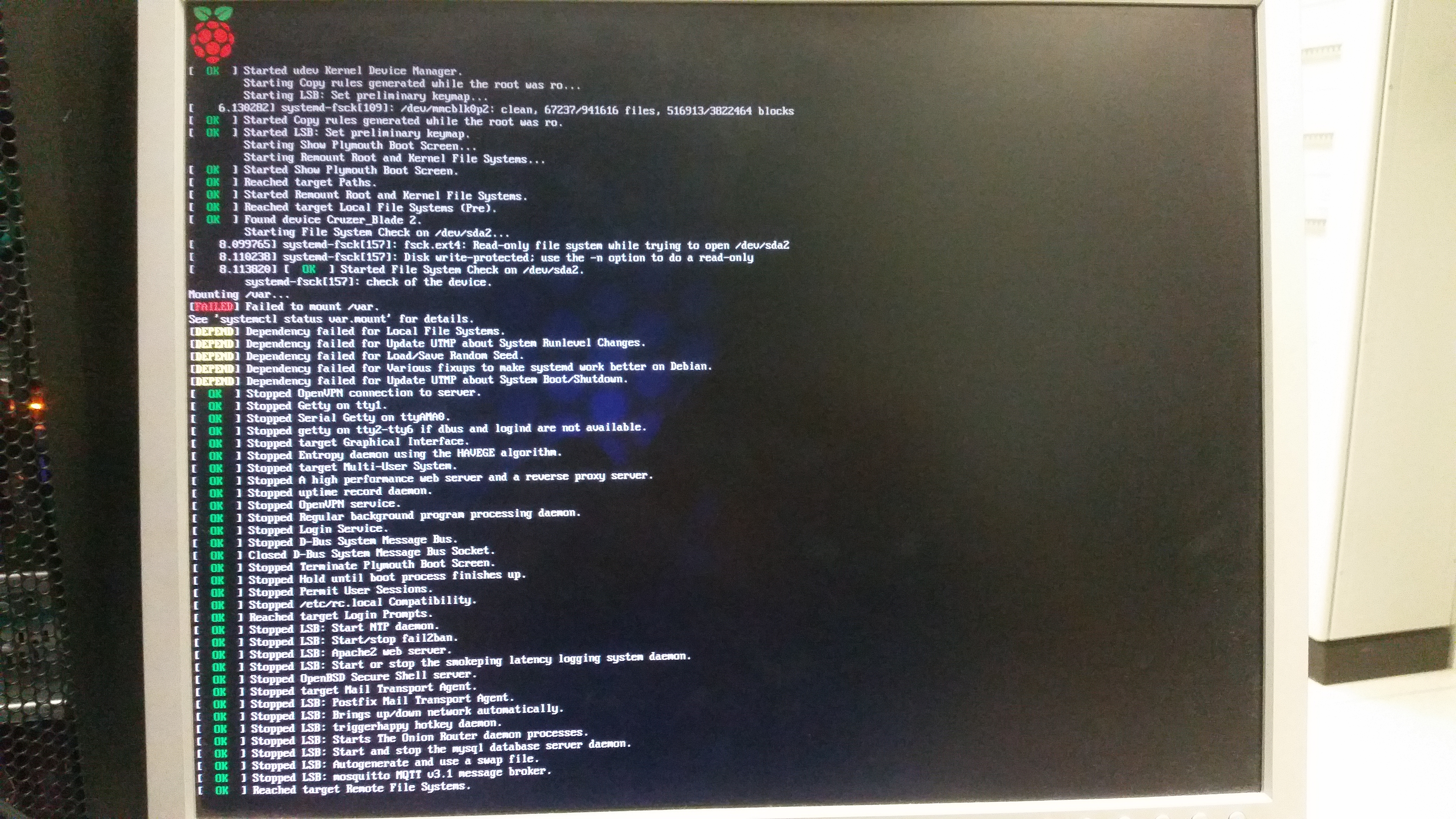 Der Servicetechniker hat dann “ungefragt” den Pi aus dem Rack geholt, angeschlossen und festgestellt das ein USB Speicher den Start verhinderte.