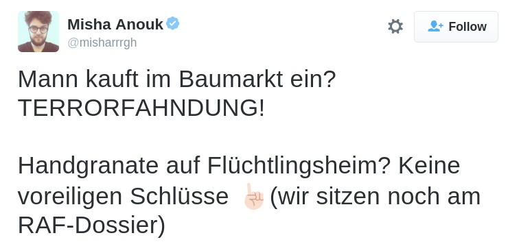 Vielleicht kann mir jemand mal erklären warum die 922 Gewaltdelikte gegen Flüchtlingsheime irgendwie weniger Aufmerksamkeit bekommen als nicht stattgefunden Anschläge gegen Deutsche. Warum ist eigentlich deren Aufklärungsrate gerade mal 27%?