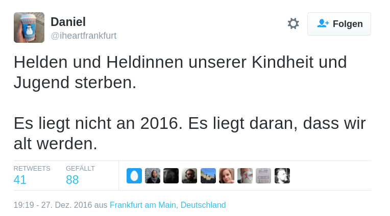 Nicht das Jahr 2016 ist schuld wenn viele bekannte Persönlichkeiten sterben, wir werden einfach älter (geklaut von Twitter)