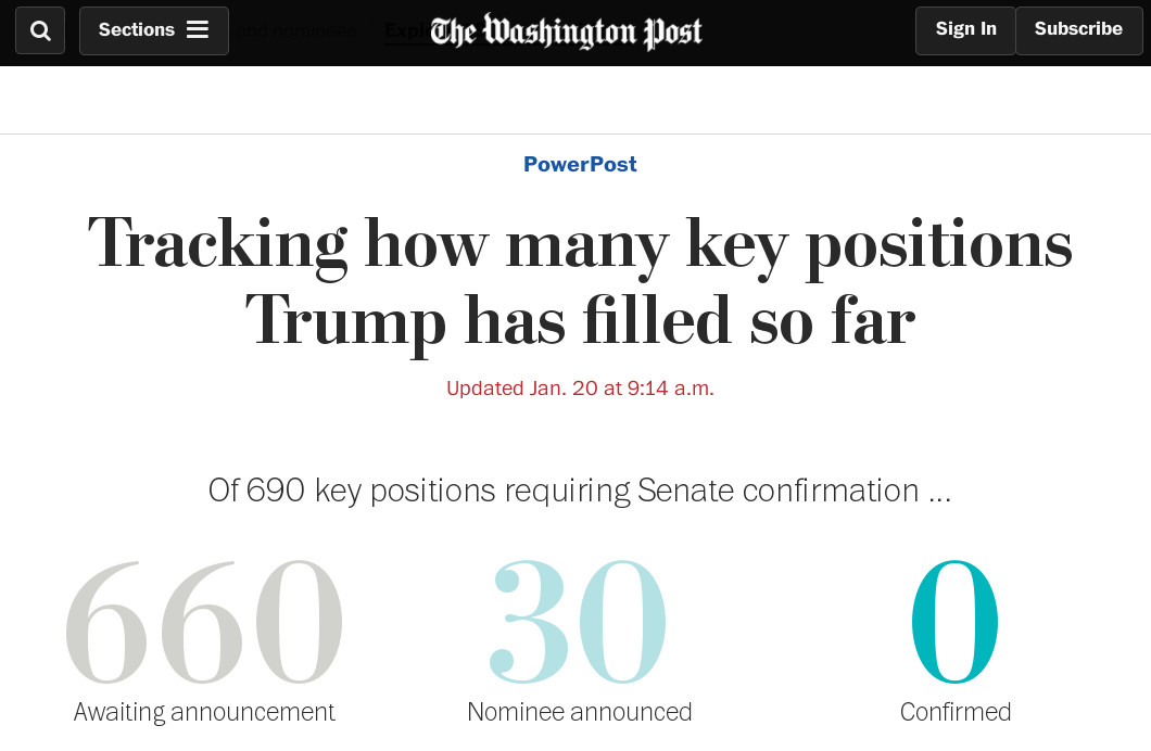 Hier kann man nachlesen wie viele offenen Stellen Trump inzwischen nominieren und besetzen konnte. Die Statistik ist erschütternd: 690 offenen Schlüsselpositionen stehen 30 Nominierungen gegenüber von denen noch keiner bestätigt im Amt ist.