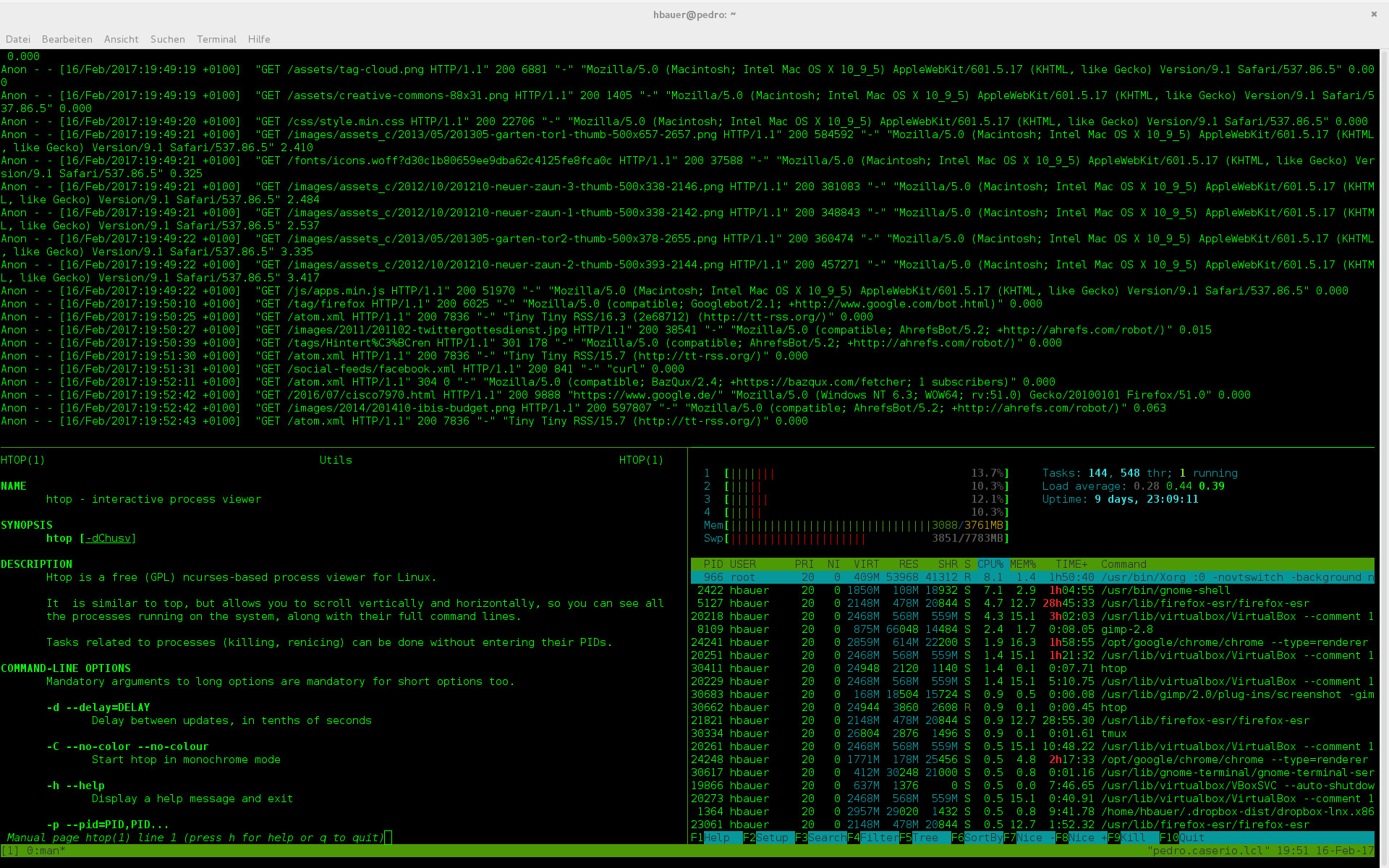 Auf diese Art kann man schön gleichzeitig Logfiles, Systemauslastung und Befehlsausführung nebeneinander beobachten
