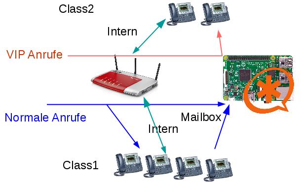 - Class2 Telefonnummern werden auf den Asterisk Server geleitet und nur bei 2 bestimmten Telefonnummern klingelt es an den Class2 Telefonen.