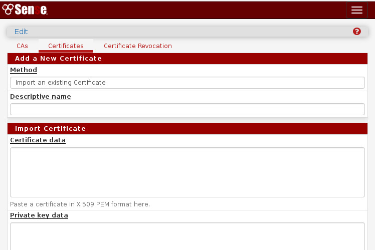 Dann geht man zu den Zertifikaten und importiert das erzeugten Schlüssel your.pfsense.key.pem und das Zertifikat aus your.pfsense.cert.pem.