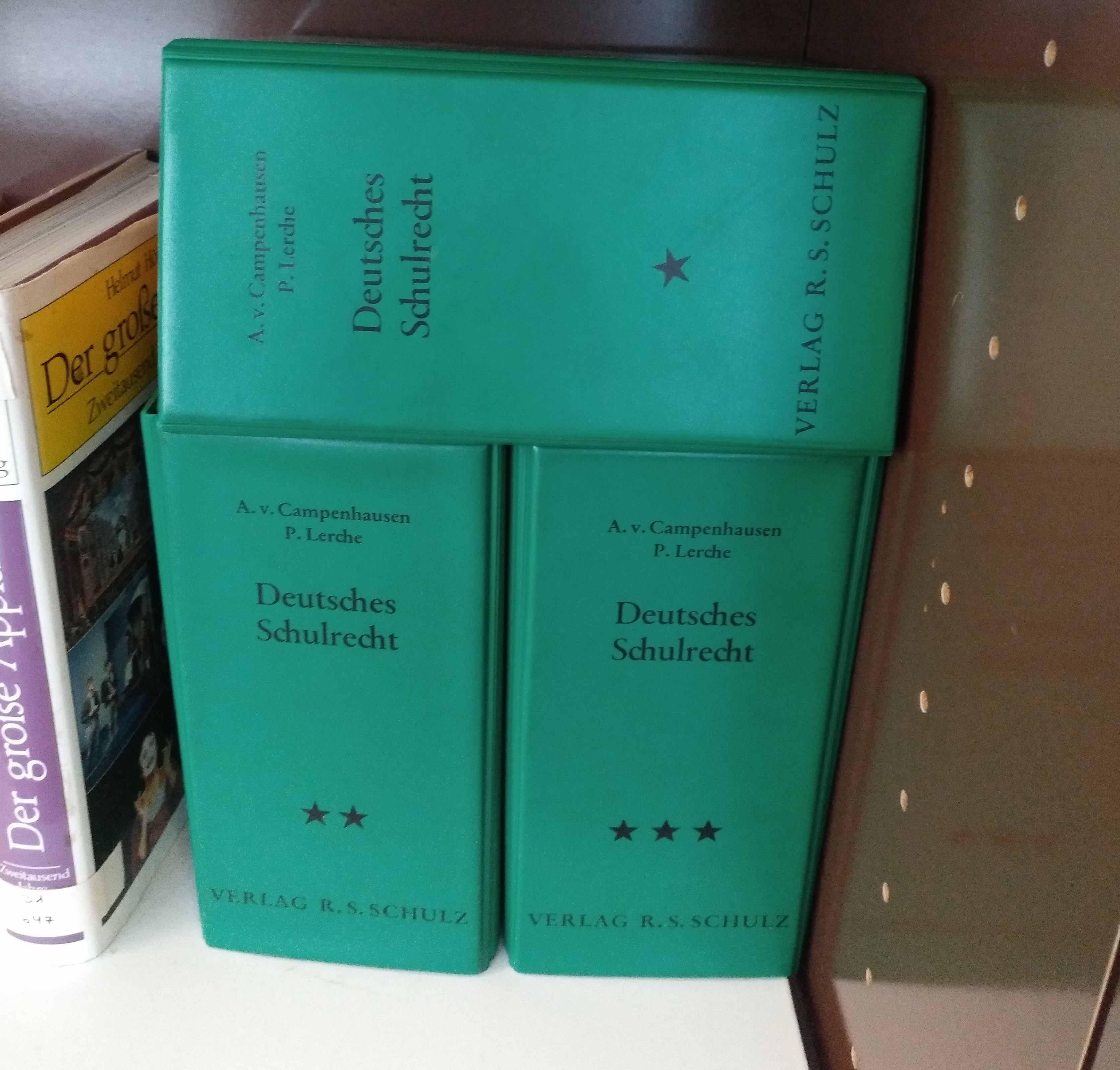 Wenn sich jemand fragt warum es mit den Schulen in Deutschland so schwierig ist braucht sich nur den Umfang des Schulrechts anzuschauen. Zum Vergleich - das Strafgesetzbuch ist nur so dick wie eins der gezeigten Bücher