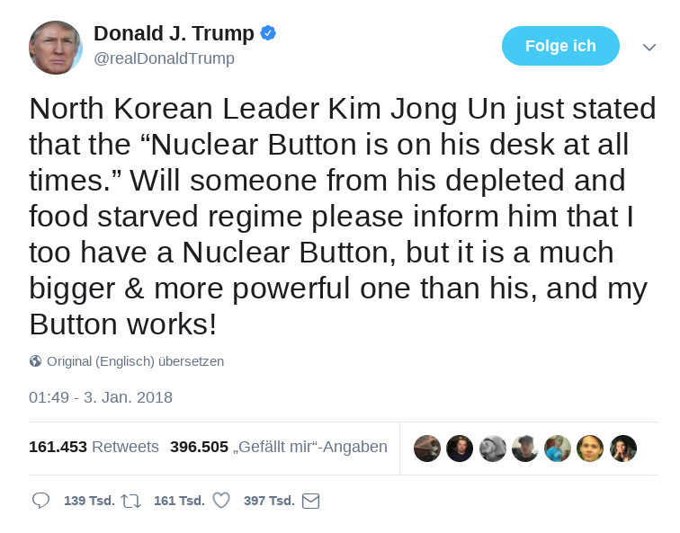Der “Führer der freien Welt” prahlt damit “einen größeren Knopf” zu haben.