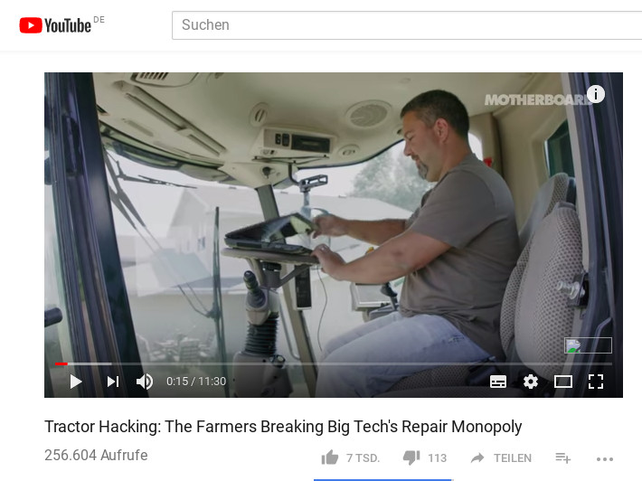 Die Innovation in den Traktoren ermöglicht viele neue Anwendungsfälle. Aber wie bei der Digitalisierung von Autos kommen hier auch viele neue rechtliche Fragen hoch, die aktuell von Herstellern ausgenutzt werden um sich eine Marktmacht zusichern. Und das aus der Sichtweise des Copyrights von Software.
