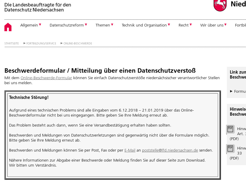 Das muss man sich auf der Zunge zergehen lassen. Der Landesbeauftragte für den Datenschutz Niedersachsen hat ein System zur Meldung von Beschwerden der Bürger bei dem er nach 6 Wochen erst bemerkt das die personenbezogenen Daten der Bürger verloren gehen.