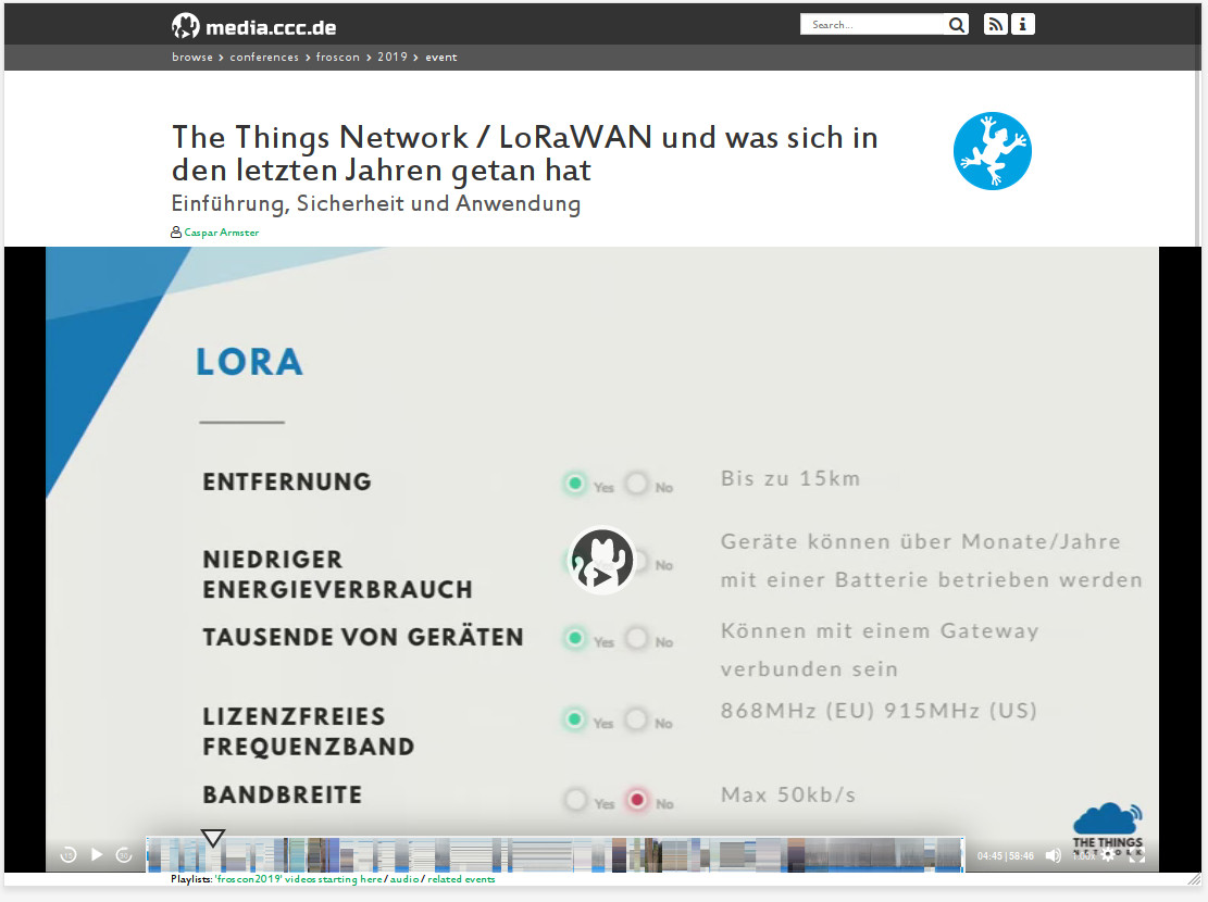 Das Thema LoRaWAN hat mich schon länger mal interessiert. Eins von den vielen spannenden Themen für das dann doch die Zeit fehlt. Wenn man wissen will was man damit machen kann ist der erste Teil von diesem Vortrag eine gute Einführung.