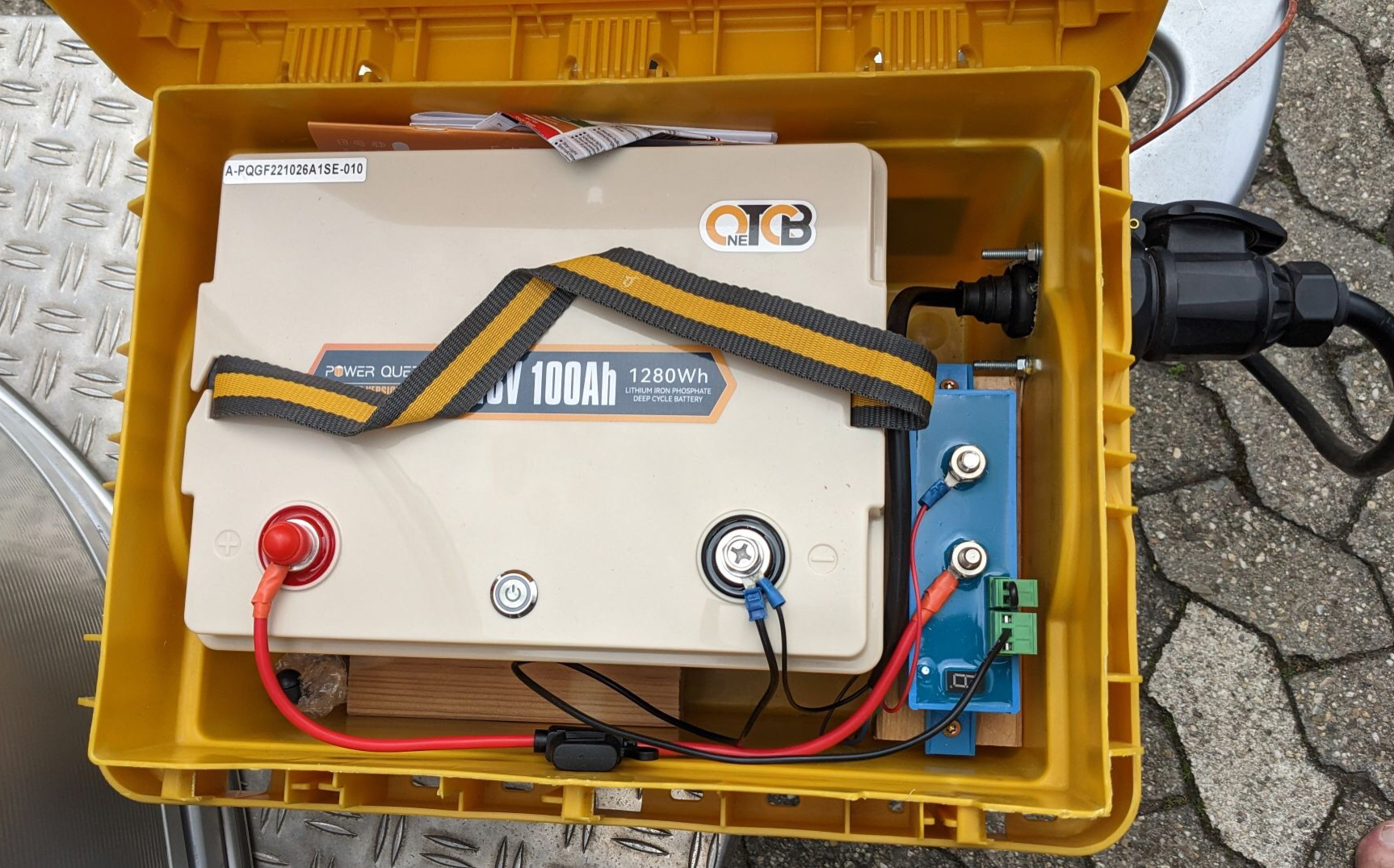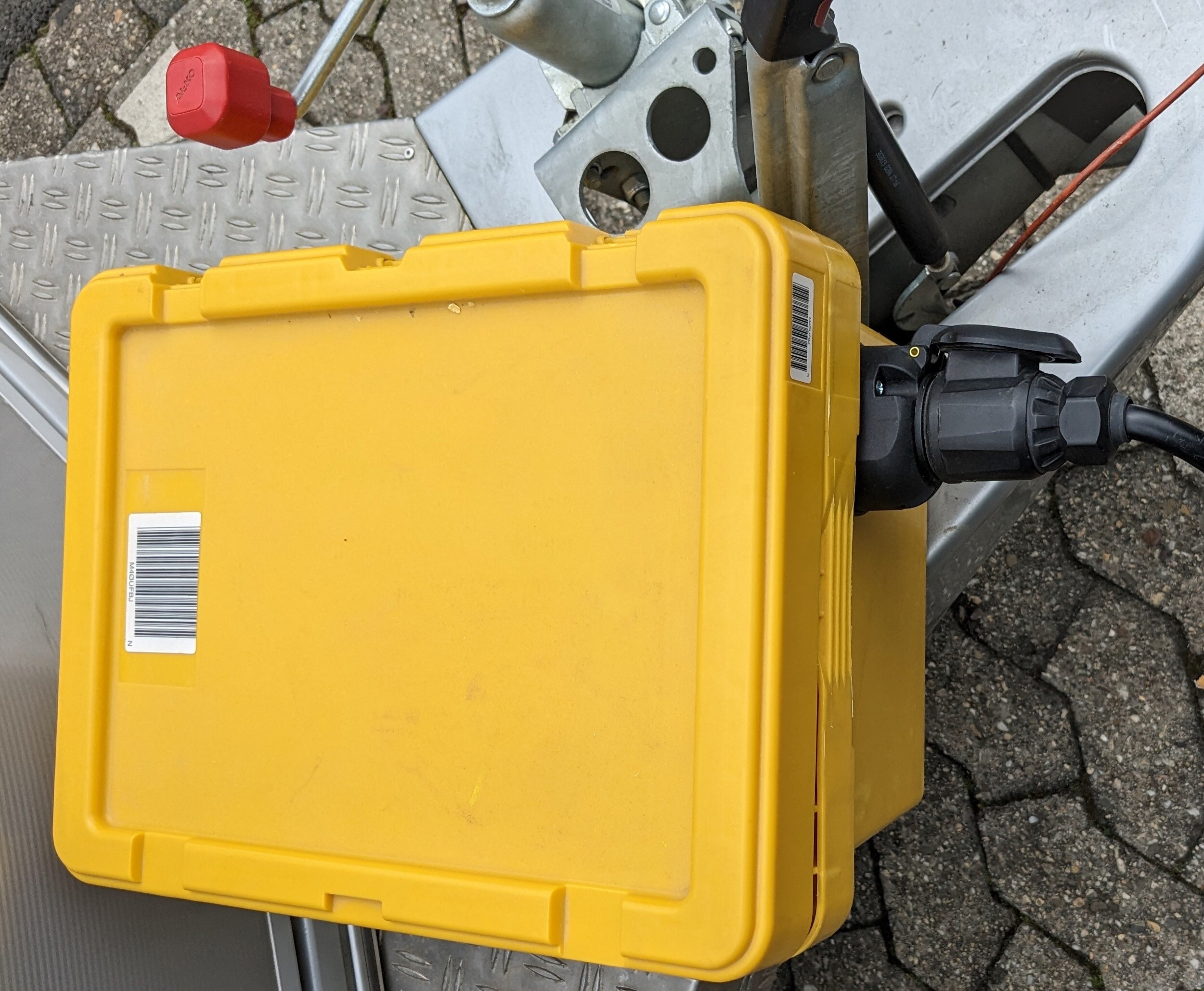 Ich nehme eine 12 Volt Batterie, packe diese in eine wasserdichte Kiste und schliesse hinter einem Batteriewaechter eine normale Anhaengerkupplungsdose dran.
