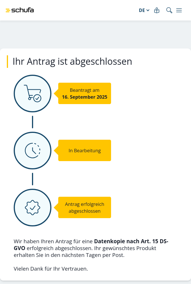 auch wenn ich die Schufa überhaupt nicht leiden kann möchte ich an dieser Stelle ein Lob für die einfache und schnelle Abwicklung der DSGVO Anfrage ausstellen. Am 16. habe ich den Antrag gestellt und heute waren die Informationen in der Post. Wenn das mal bei allen so funktionieren würde.